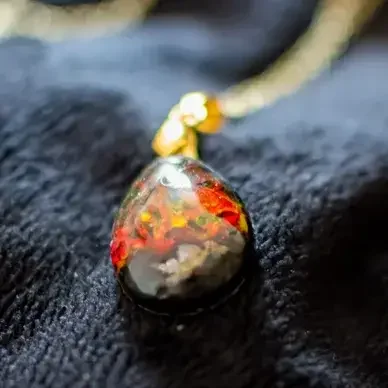 Small pieces of your coals will be set in a small teardrop shape and detailed with fiery colours, then hung on your choice of chain.
