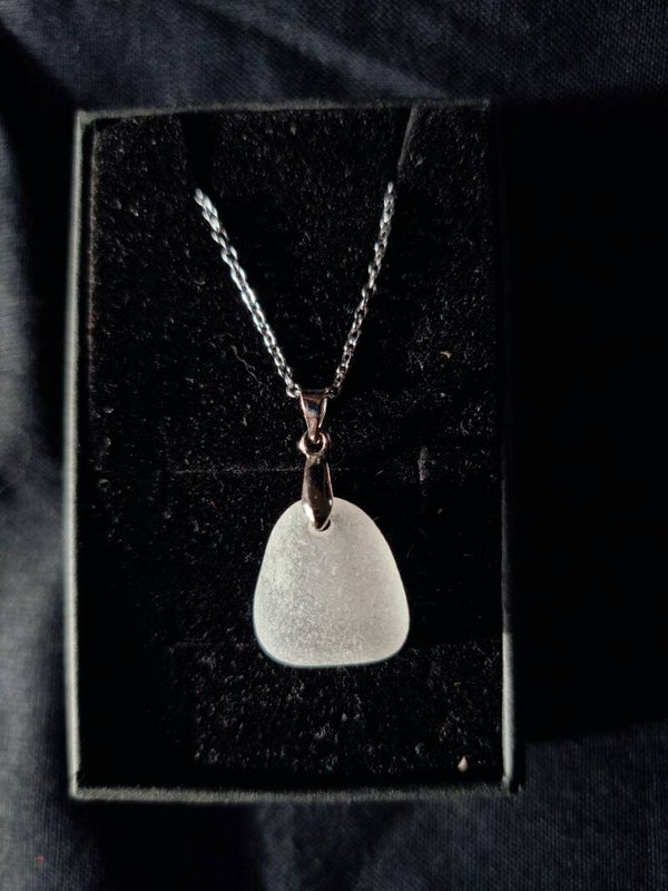 Carefully selected from the beautiful shores of Kirkcaldy, this frosted white piece of naturally tumbled seaglass has been hand crafted into this beautiful necklace using sterling silver.