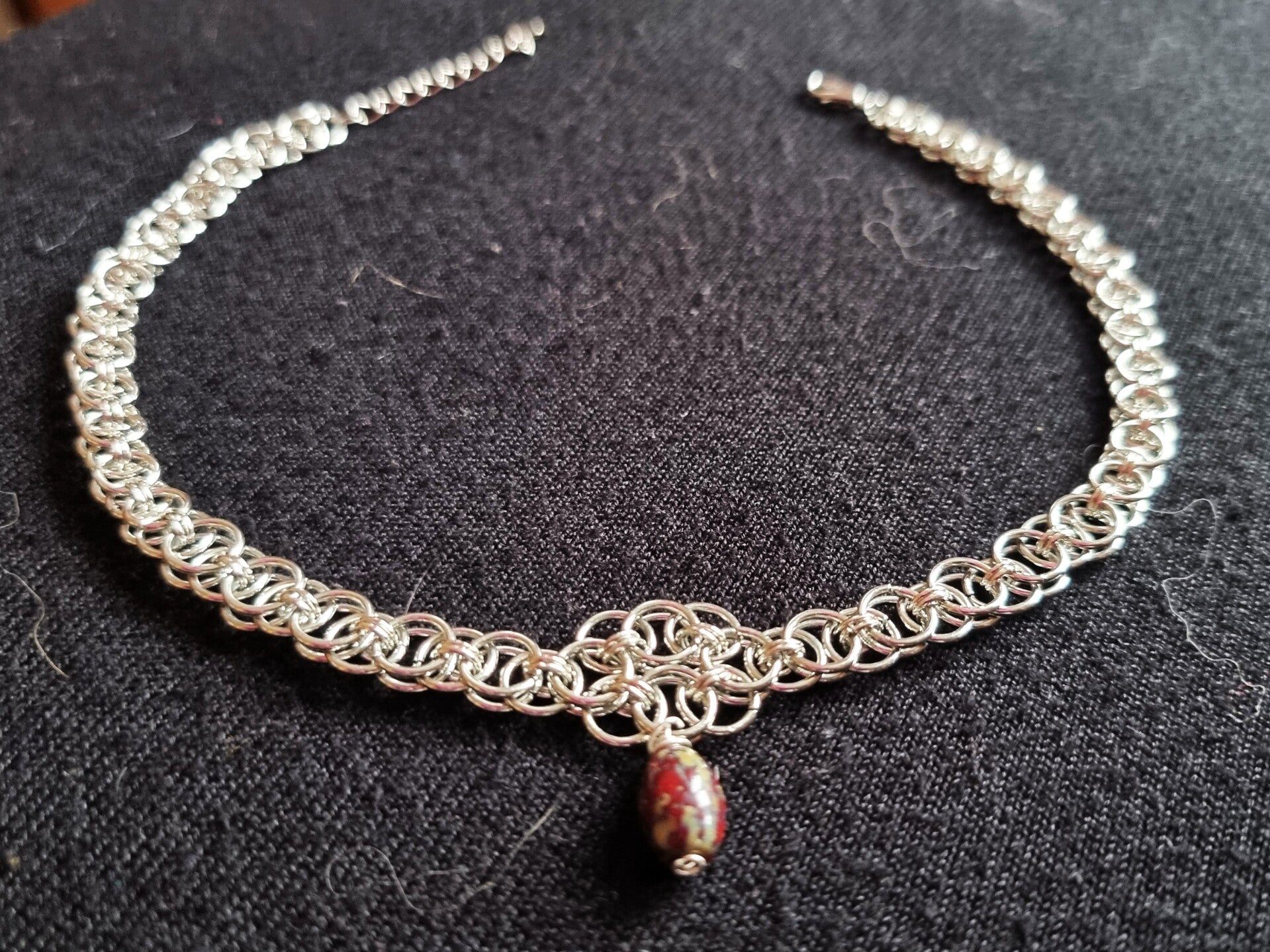 A chainmail choker necklace, fit for a queen. A chainmail design, intricately made by hand using stainless steel, with a length expander to ensure a perfect fit.